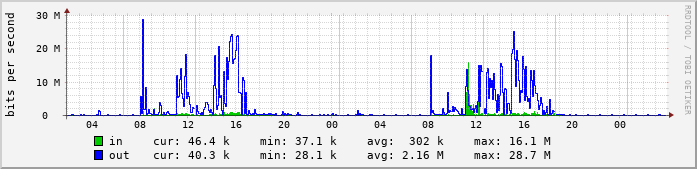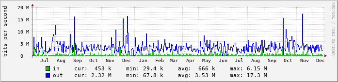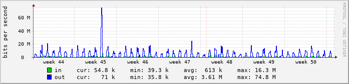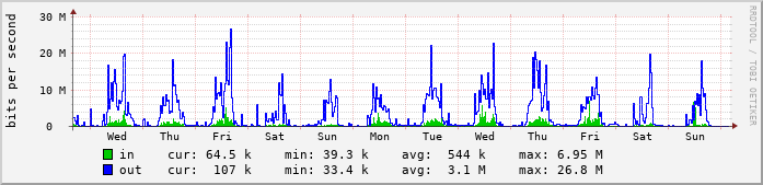 RRDTOOL GigabitEthernet0/0/0/13 - Cust: Spordimuuseum , maximum bandwidth: 1 000 000 000 bps permalink